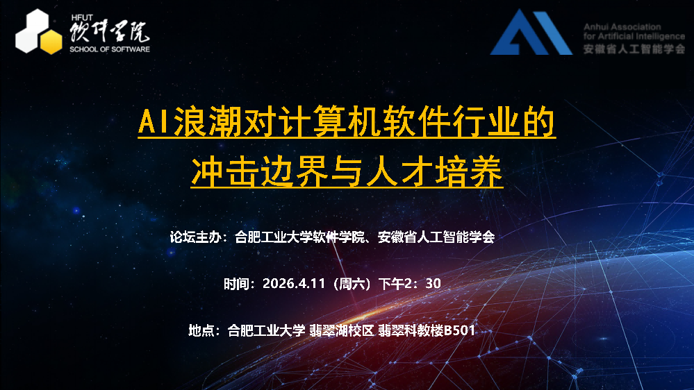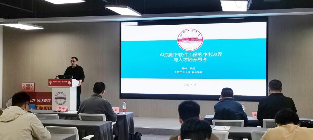 2026 年 4 月 11 日下午,由合肥工业大学软件学院、安徽省人工智能学会联合主办的 “AI 浪潮对计算机软件行业的冲击边界与人才培养” 主题论坛,在合肥工业大学翡翠湖校区顺利举行。省内外高校专家学者、知名企业技术负责人及学院师生代表齐聚一堂,共同探讨 AI 浪潮下计算机软件行业的发展变革与人才培养创新路径。论坛由合肥工业大学软件工程系副主任张高峰主持。